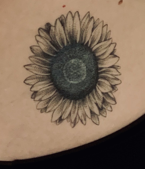I decided the best thing to do was to get it covered with another. Twenty years later and I took a slightly different approach. I spent a year deciding what the perfect tattoo would be, looks at loads of artist work and then got another tattooed friend to recommend someone. I went with a Sunflower as they always try to find the light. I know, bleurge! As I get older I’m becoming more annoying and cheesy. It also has a good dark centre to cover the evil blue mess. Although I quite like the ghost of the old one still sticking around, a reminder of those earlier choices.